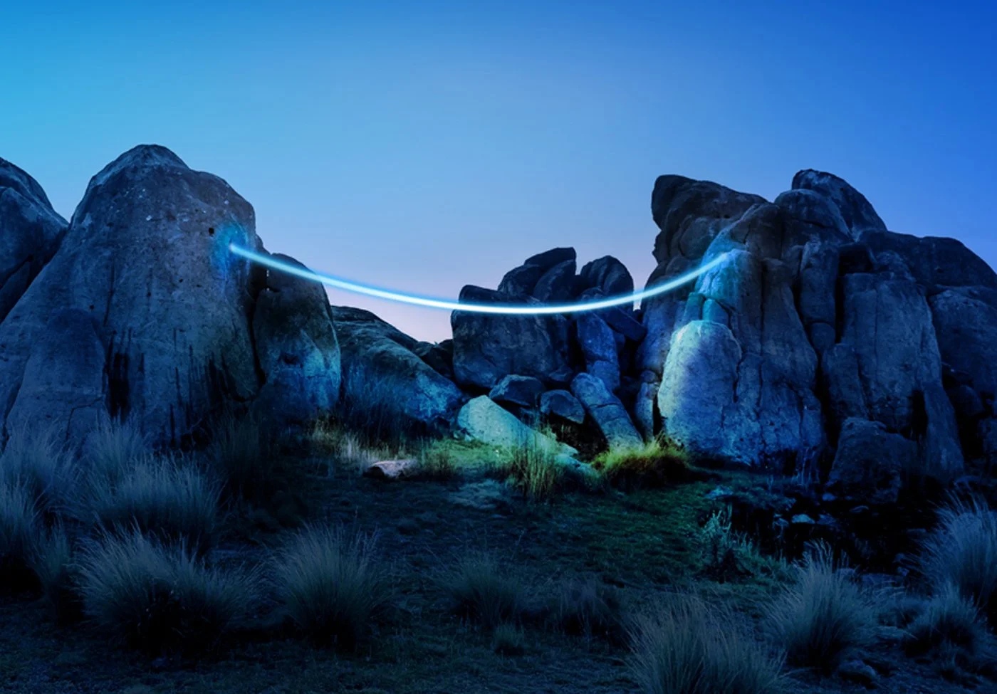 Illuminated neon fractures cutting across landscapes, symbolising shifting borders and ideological divides.